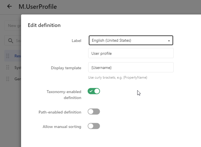 Indicates that entities of this definition are taxonomy items, which can be used in a search facet. The definition used for the facet must be a parent of the searchable definition. For example, M.AssetType must be a parent of M.Assets for the asset type facet to appear on the asset details page.