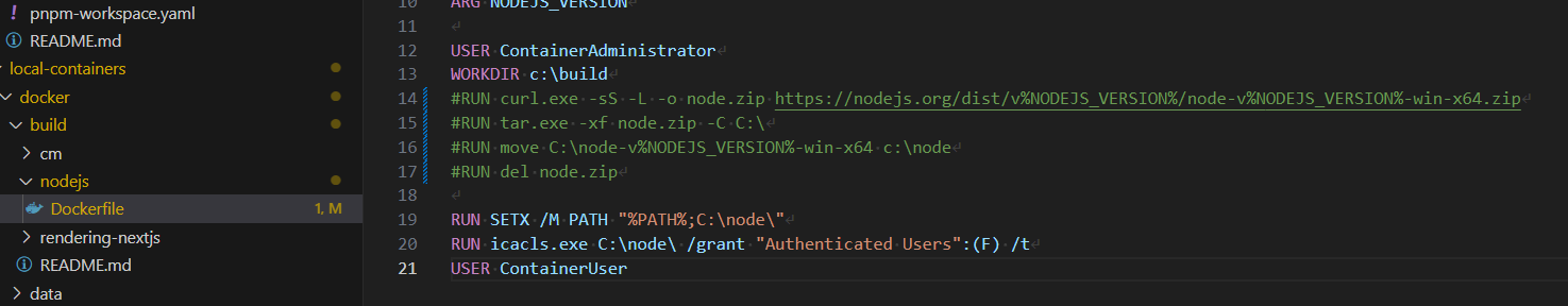 tar.exe -xf node.zip -C C:\nodeThen update the nodejs Dockerfile