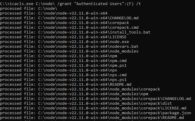 icacls.exe C:\node\ /grant "Authenticated Users":(F) /t