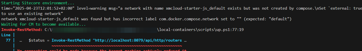 Error response from daemon: failed to create endpoint xmcloud-starter-js-solr-1 on network xmcloud-starter-js_default: failed during hnsCallRawResponse: hnsCall failed in Win32: The process cannot access the file because it is being used by another process.