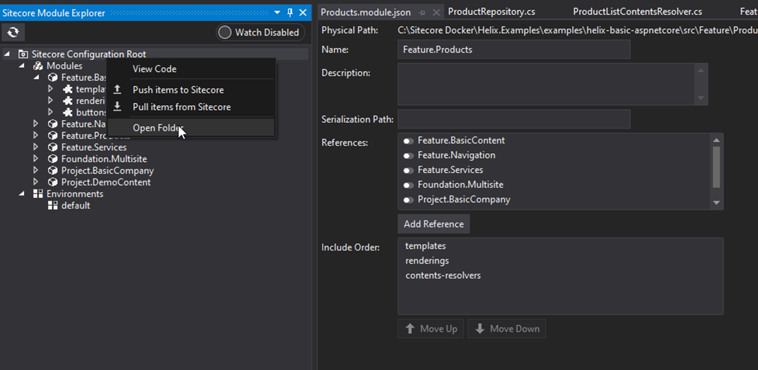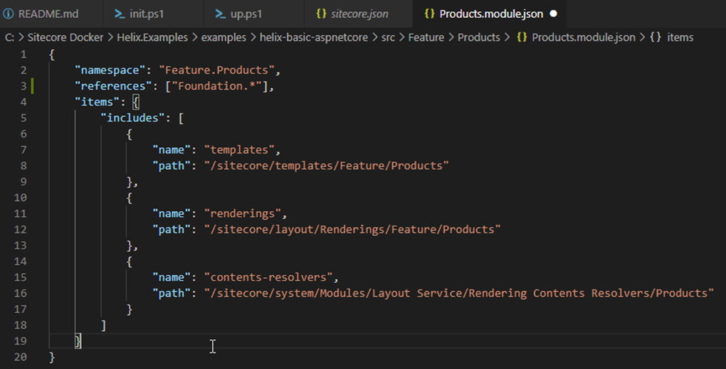 Here is an example of a Products.module.json file. And as you can see, this definition is very similar to how Unicorn works.