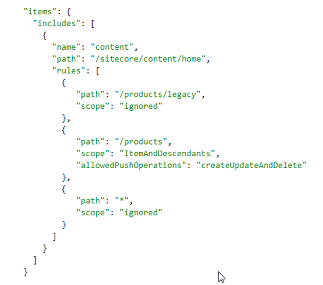 Else, if the path matches /sitecore/content/home/products, the scope is ItemAndDescendants with allowedPushOperations createUpdateAndDelete