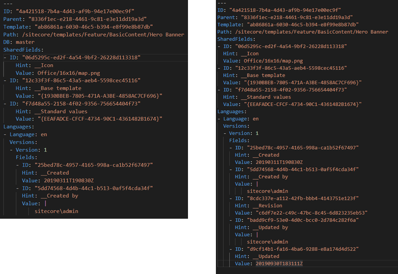 Let's have a look at a serialized item itself. In the screenshot below you have a Hero Banner which I serialized in Unicorn (left) and with Sitecore Serialization (right).