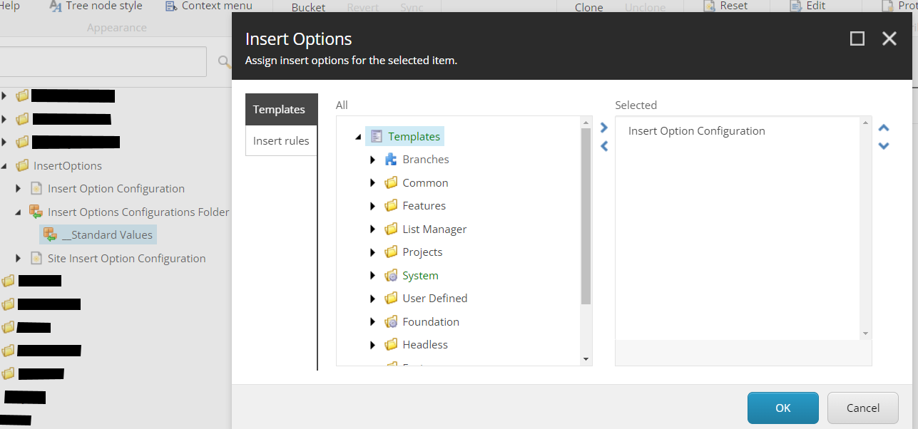 Additionally insert options defined on the standard values are extended with the insert option configuration templates. So you can define general insert options on the standard values which will be applied in every site. And site specific insert options can be controlled with the newly created configuration.
